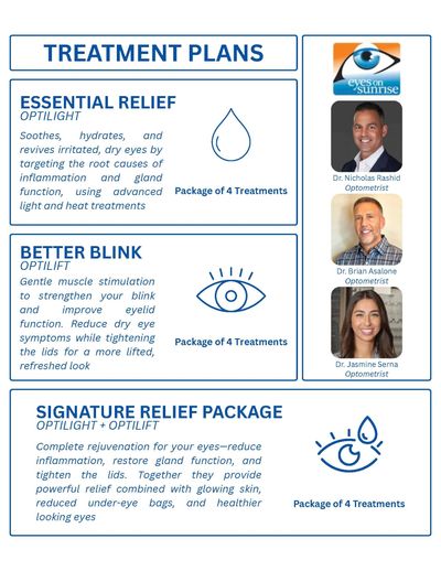 We are now offering the FIRST AND ONLY IPL FDA-approved for the management of Dry Eye Disease due to MGD. We do a thorough ocular surface evaluation with imaging, meibography, Inflammadry and Omega -3 testing, when indicated. The treatment prescribed is unique to each patient. Our optometrists can diagnose and treat dry eye syndrome using a variety of methods, including prescription eye drops, punctal plugs, lifestyle changes and many in-office treatments.